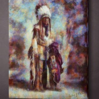 Many Trails”Many Trails’ road over hills and mountains to pose for a photo only to have his spirit stolen in trade for his favorite bottle of white man’s fiery liquid gold. Effect nice colorful pastel and colored pencil.