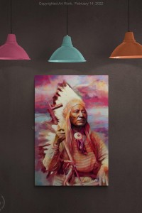 Flowing hot and cool colors working together brings you “Peaceful Warrior.” In one hand a peace pipe and caressed in the other a thunder stick.